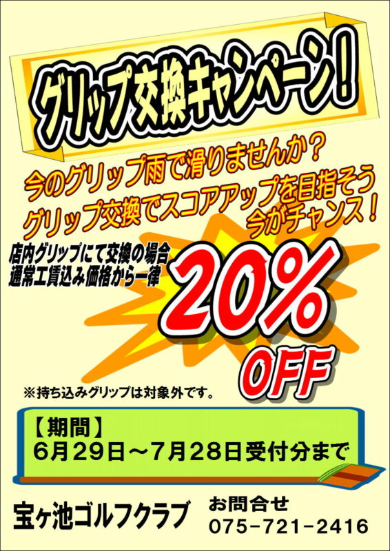 グリップ交換をして頂いた全てのお客様、工賃込みの価格から一律20%OFFのキャンペーンを