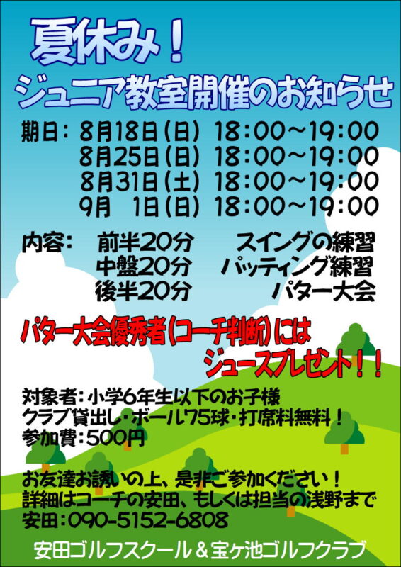 少し先になりますが、安田ゴルフスクールとの共同企画『夏休みジュニアゴルフ教室』を