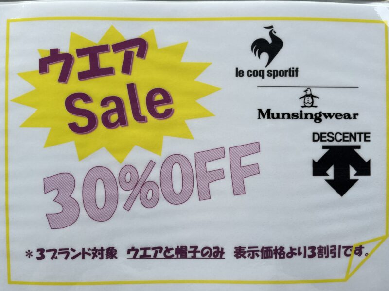 ウエアと帽子のみですが、表示価格より3割引き致します。