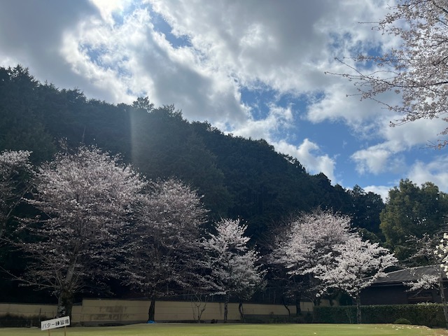 駐車場入り口とパター練習場一面桜色に包まれています。